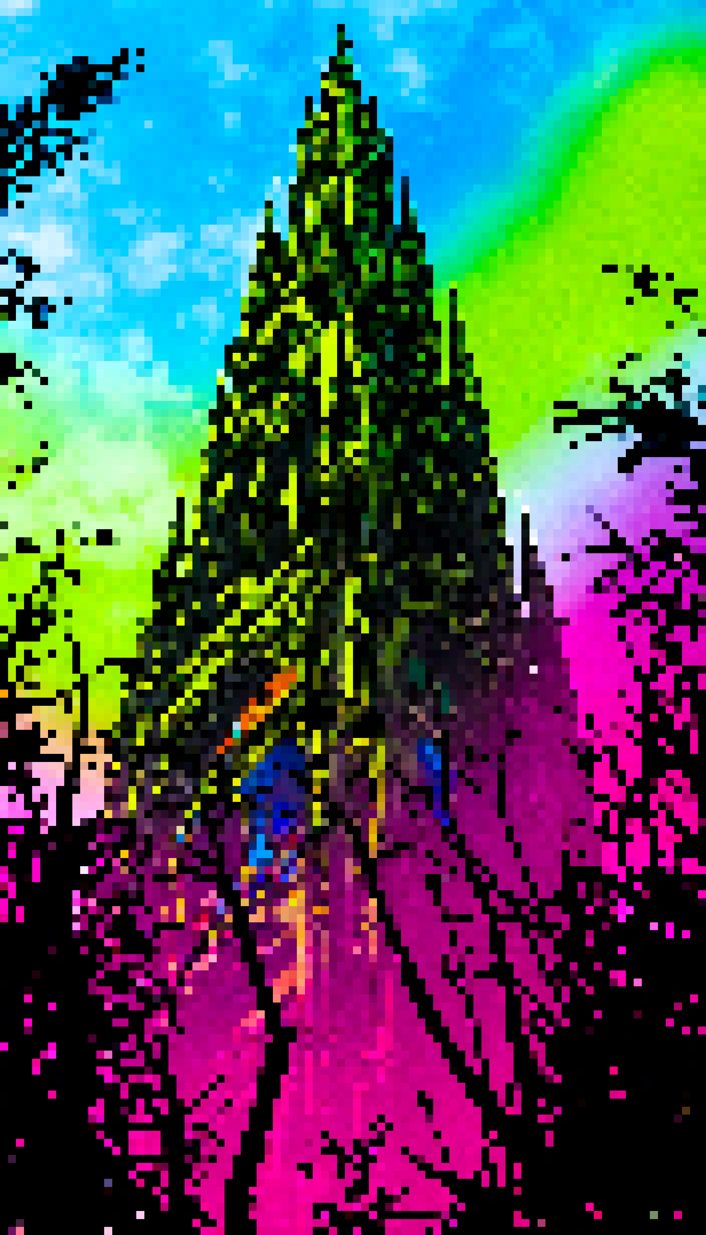 The colors used in this artwork are bright and vivid giving the image an almost psychedelic appearance. The art style leans towards realism but the color palette used suggests an Marisolic flair rather than strict adherence to realism. There is no visible text on the image. The overall composition of the image places the cathedral in the center with the natural elements and sky forming a harmonious background that complements the central subject.