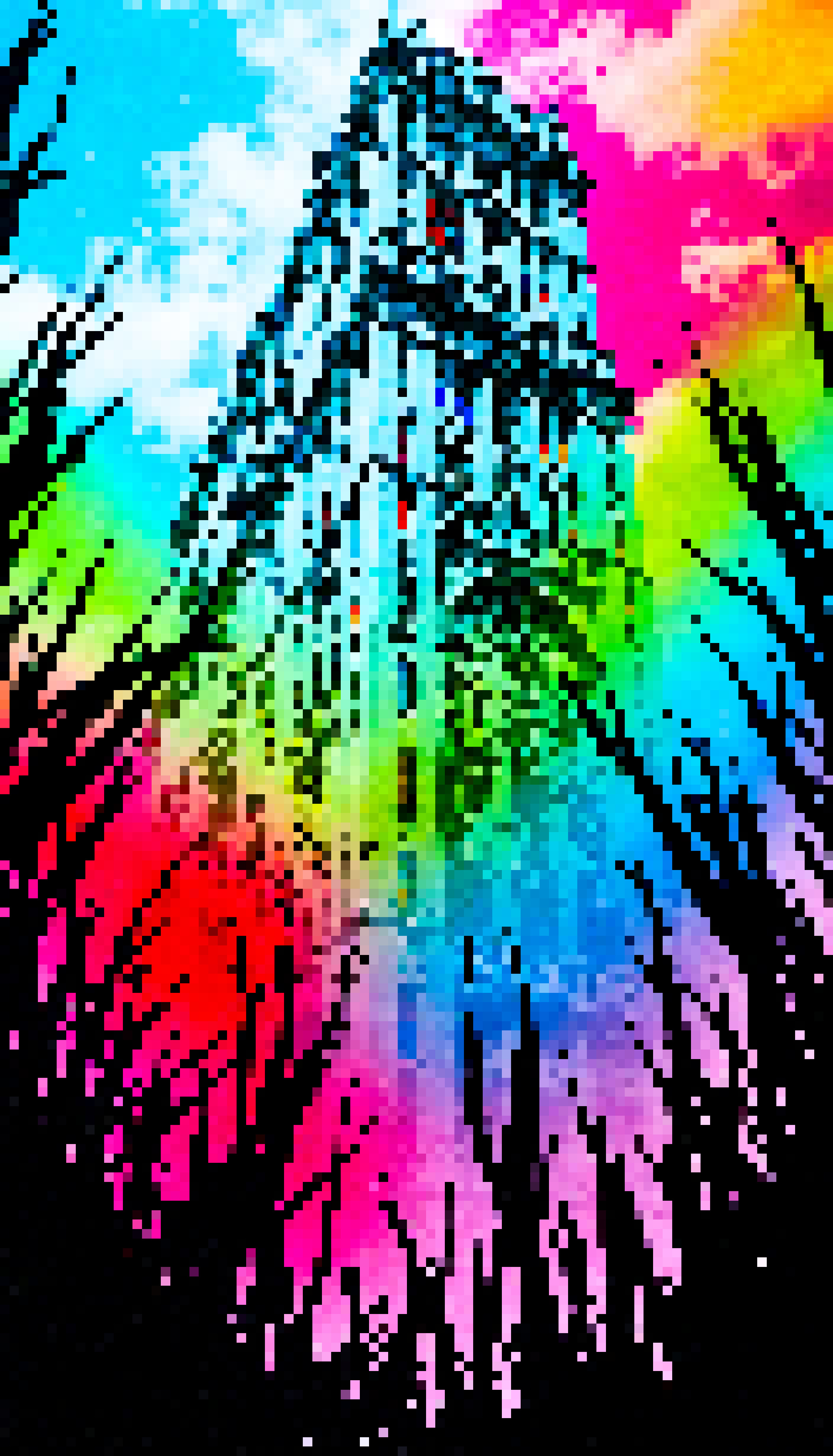 The style of the image is vibrant and colorful with the most striking elements being the rainbow spectrum from the building and the vivid colors of the background which include shades of purple blue green yellow orange and pink. The photograph seems to have been edited to emphasize these colors and create a whimsical or surreal effect.
