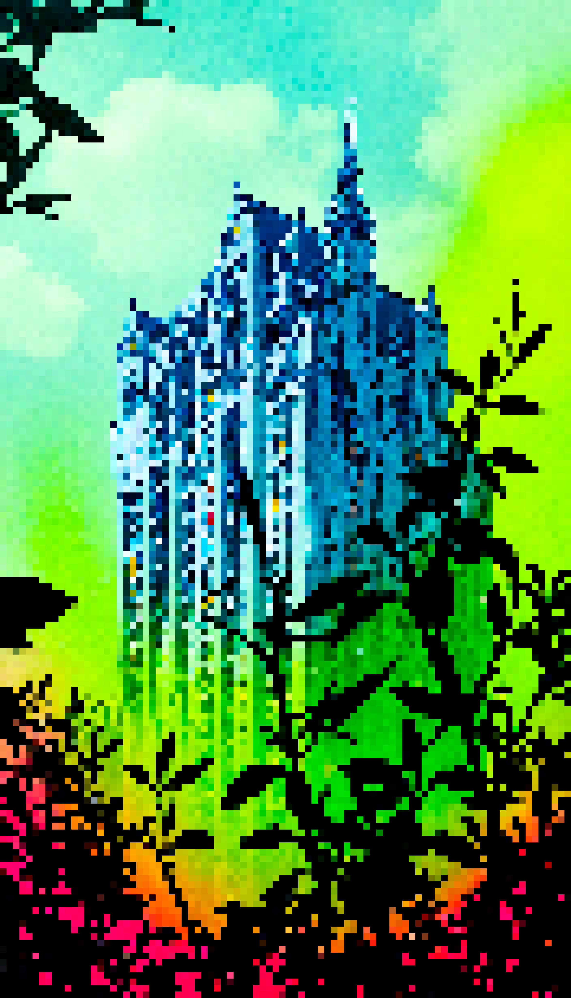 The image is a vibrant collage of an urban scene dominated by a tall skyscraper with a pointed roof reminiscent of the Chrysler Building. The building's intricate architectural details are accentuated against a backdrop of a vividly colored sky that transitions from blue at the top to a blend of green and pink towards the bottom.
