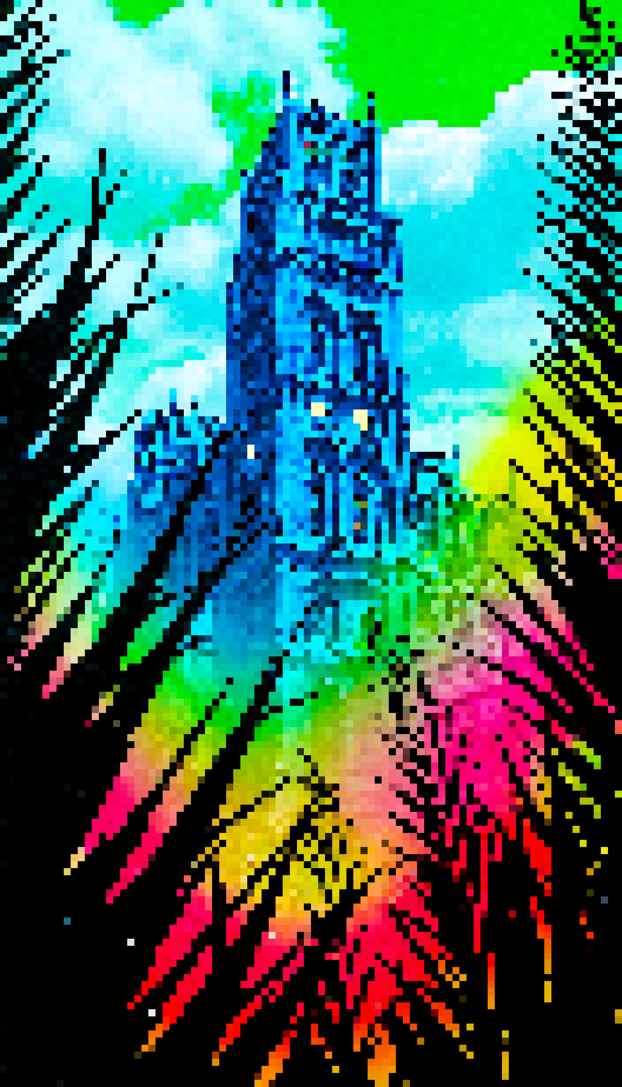 The image is a photograph that has been digitally altered to appear as a colorful pixelated painting with vibrant colors. The central focus of the image is a large cathedral with multiple towers and steeples each crowned with crosses. The architecture suggests an historical Gothic style. In the foreground there are palm fronds with a vivid green hue partially obscuring the view of the cathedral. Overlaying the image in the lower right corner is a rainbow-colored digital glitch effect that creates the appearance of a pixelated screen. The overall style of the image combines elements of realism with digital art techniques to create a surreal and colorful effect.