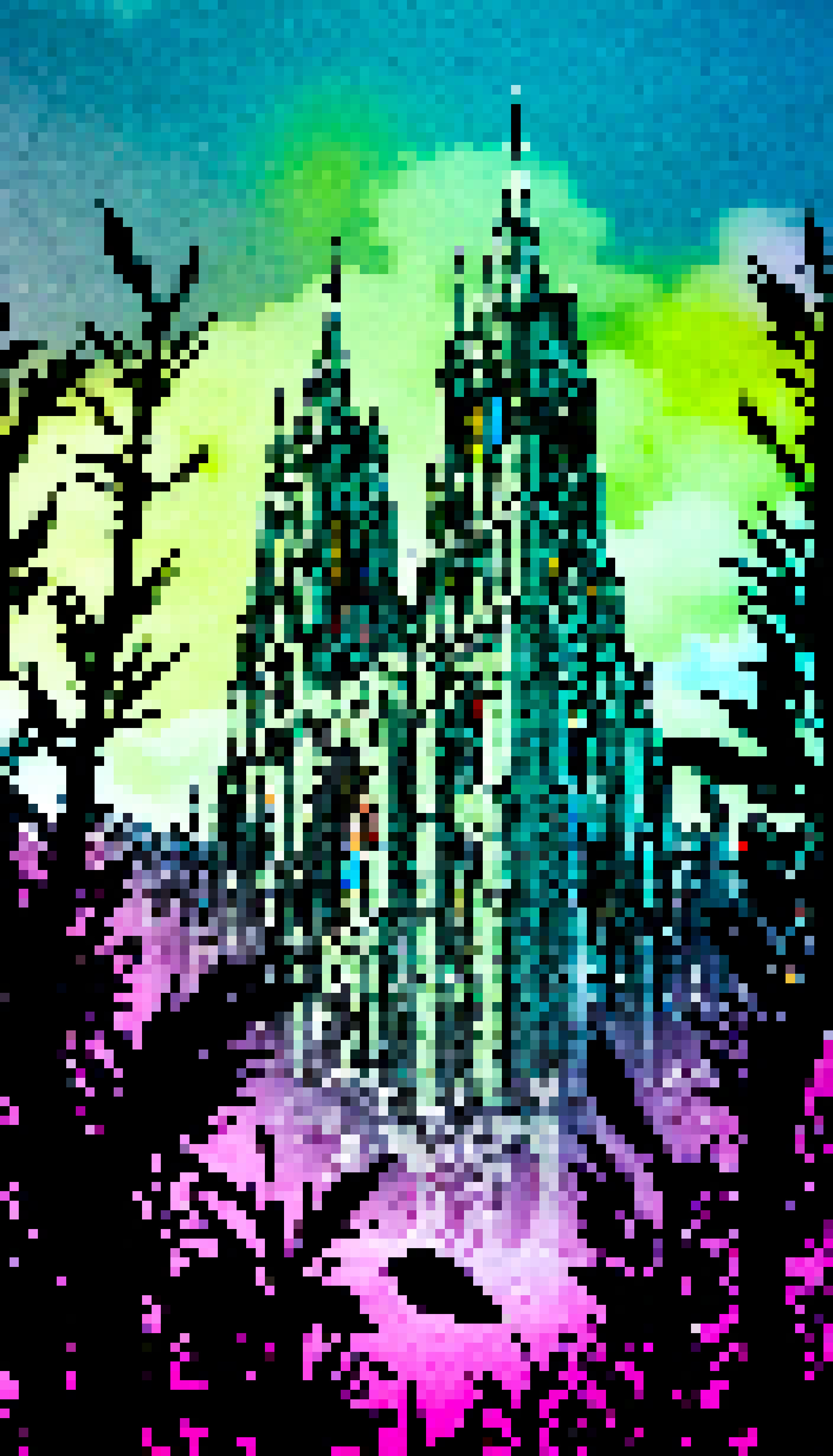 The image presents a vibrant scene set against a backdrop of an intricately designed church. The church painted in hues of purple and green stands out with its multiple spires reaching towards the sky. A large cross adorns one of these spires adding to its grandeur.