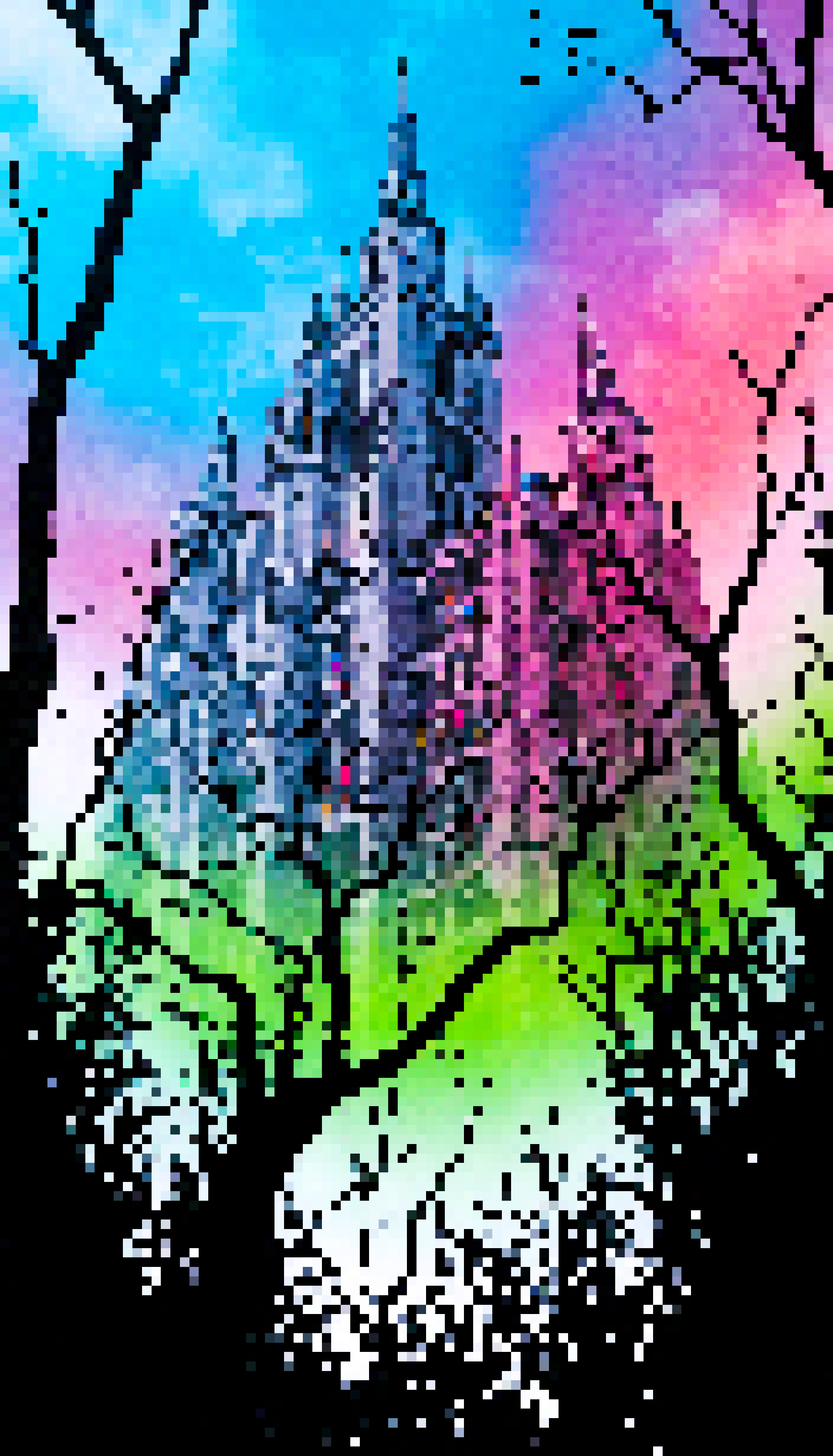 The image is a digital art illustration of a cathedral-like structure set against a colorful background. In the foreground there's a tree with bare branches and what appears to be snow or frost on its leaves which are dark brown. To the left side of the image a rainbow spectrum of colors is visible creating a vibrant backdrop. The central structure in the image has two spires; both spires are topped with domes and crosses.
