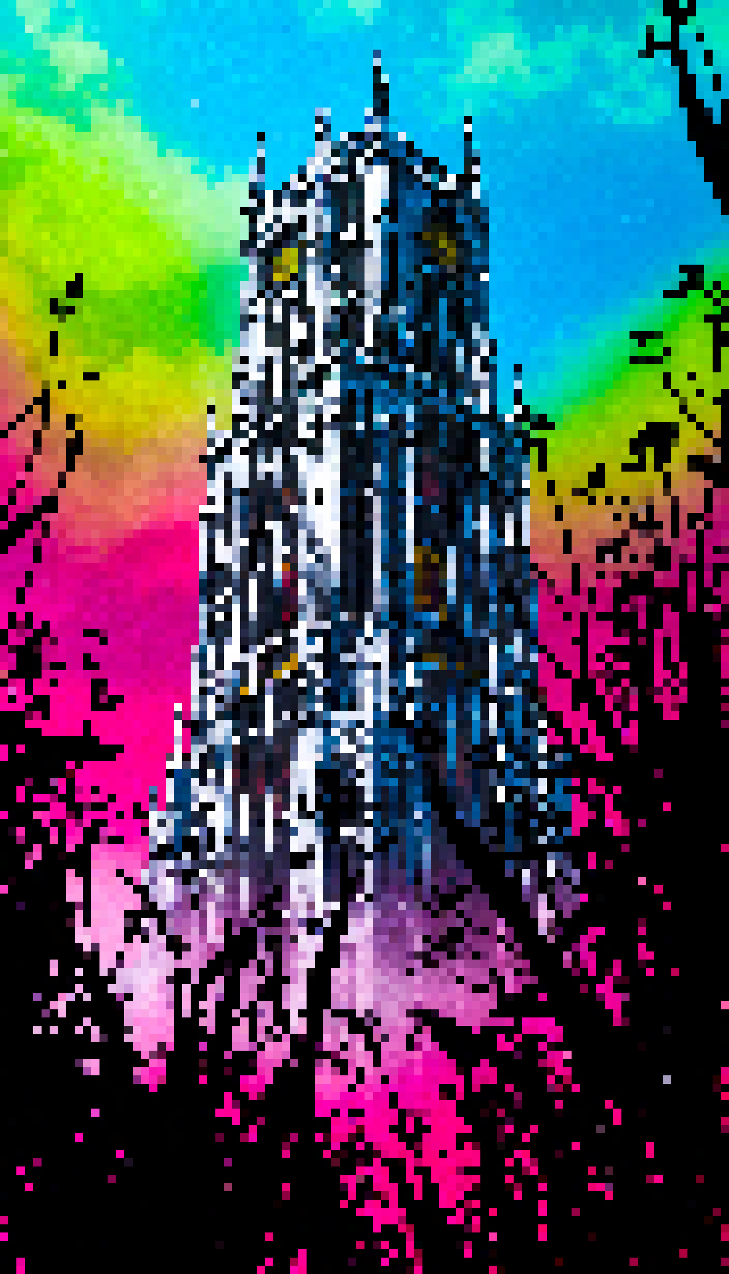 Adding to the Marisolic flair there are streaks of light in hues of purple and yellow that seem to radiate from the tower illuminating the surrounding area. The ground is carpeted with grass providing a natural carpet for the tower.