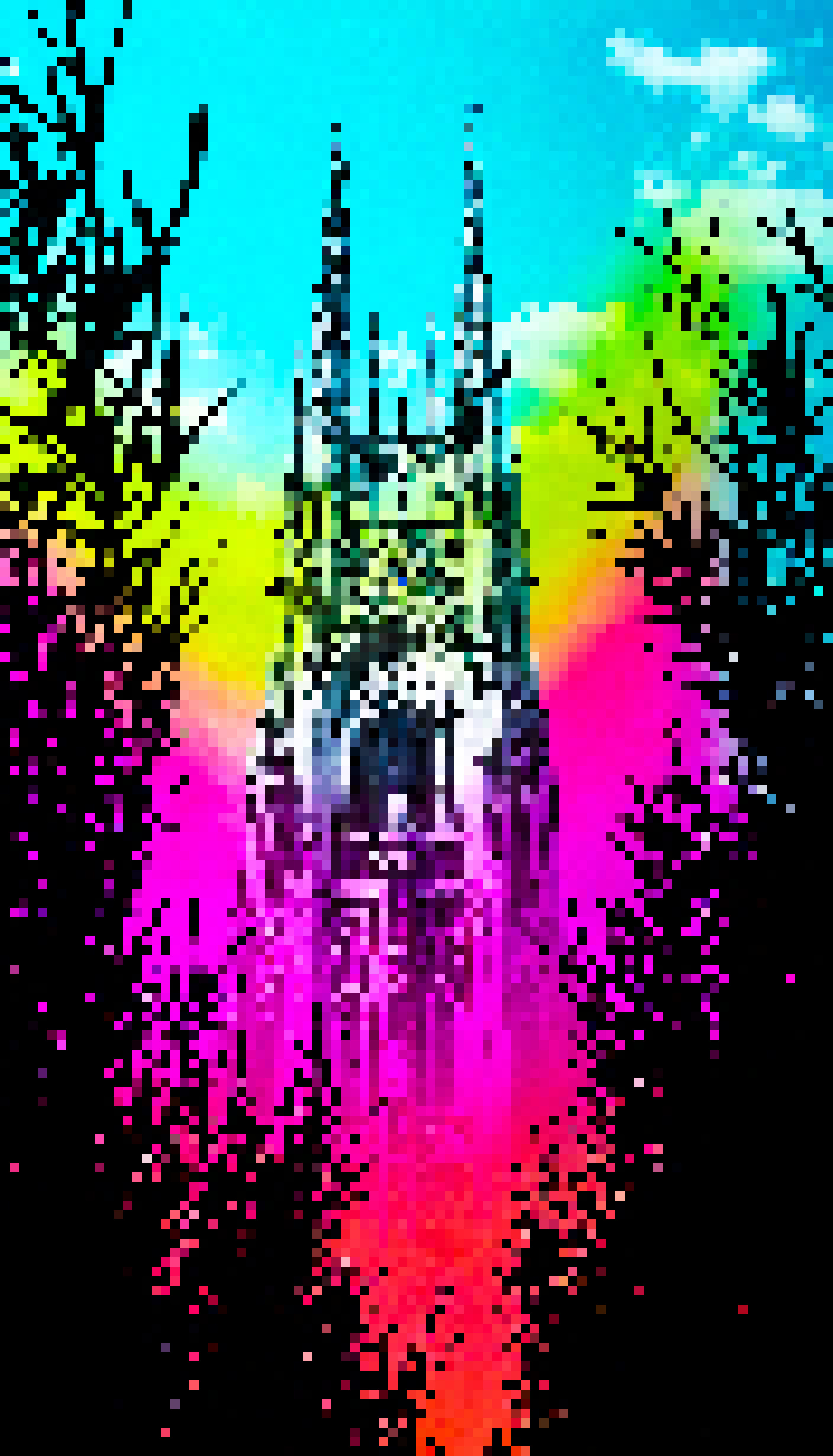 On the right side of the image there's an abstract graphic element. It features colorful rays emanating from the lower part of the tower which seem to merge with and create a lush canopy of greenery. The rays are a riot of colors predominantly in shades of pink yellow and green reminiscent of a neon light display.