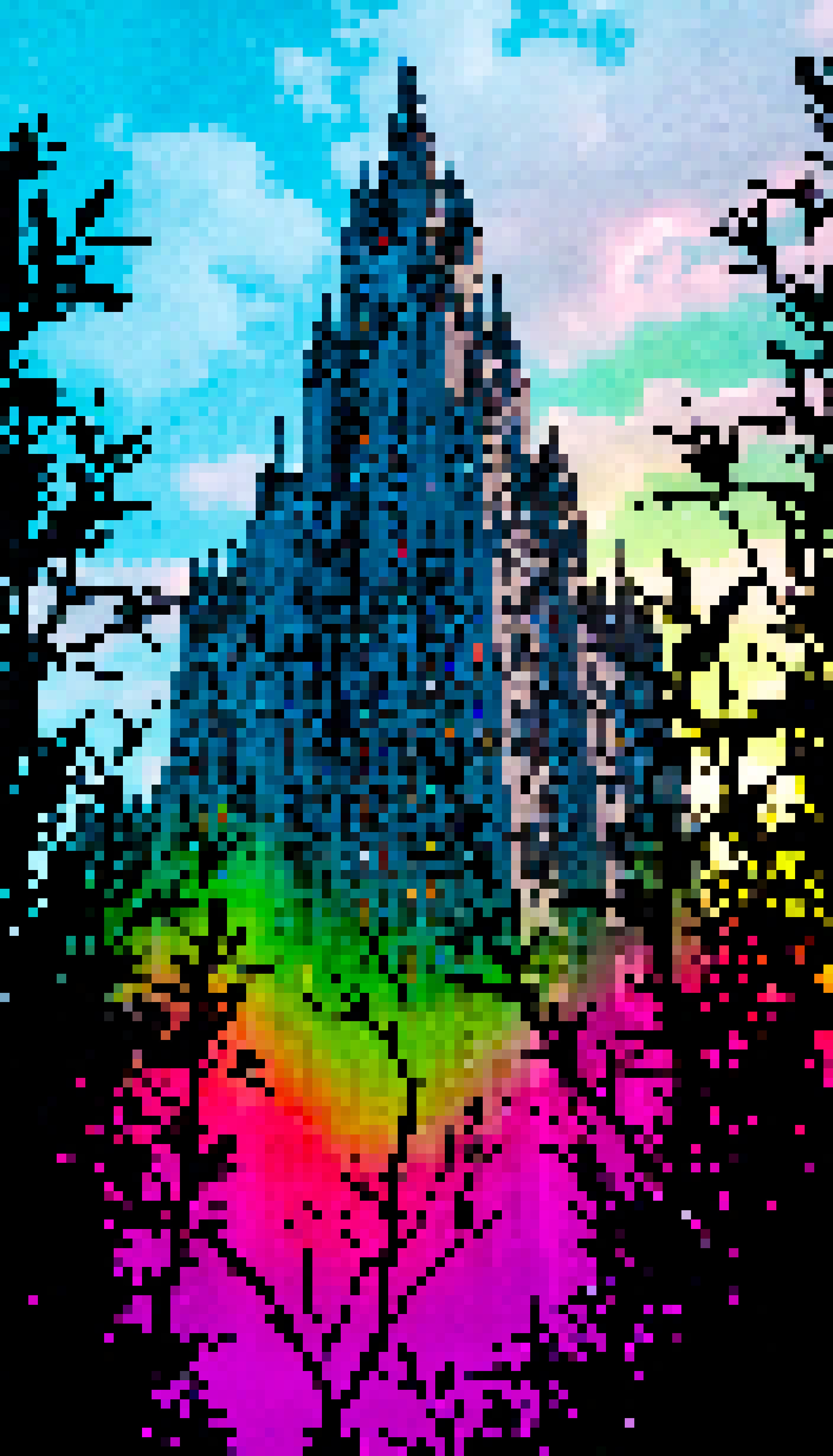 The overall style of the image suggests that it may be digitally manipulated to blend elements of the two photographs in a surreal way. The rainbow in the foliage is particularly noticeable due to its size and brightness.