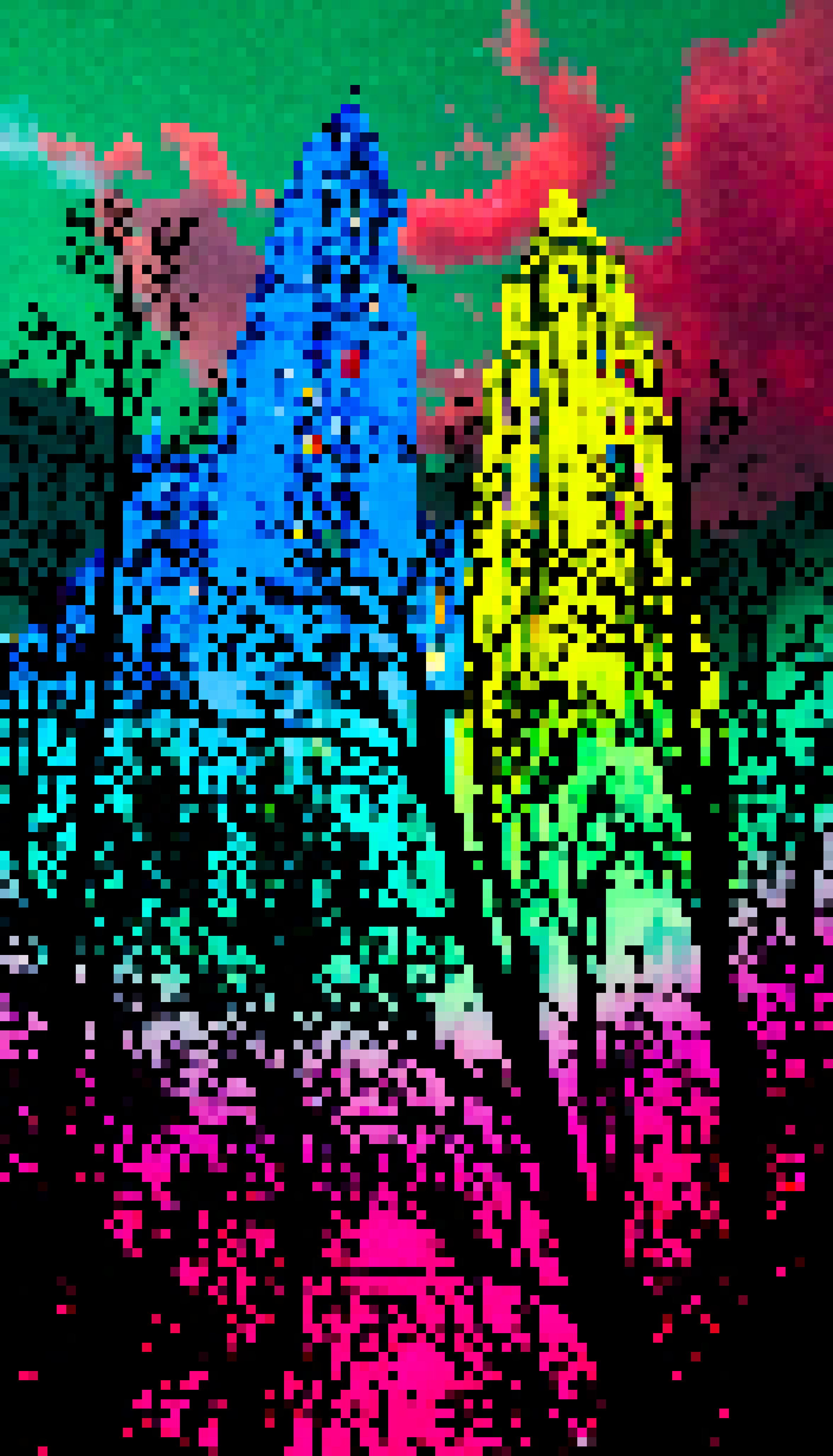 The image is a vibrant and Marisolic representation of the Boston Cathedral. It's taken from a low angle making the cathedral appear tall and imposing. The sky behind it is painted with rainbow colors adding a whimsical touch to the scene. On either side of the cathedral are trees their bare branches reaching out into the colorful sky. A blue and red nebula can also be seen in the background providing a stark contrast to the bright colors in the foreground. The image is divided into four quadrants each telling its own story. It's an unusual blend of reality and imagination creating a visually striking image.