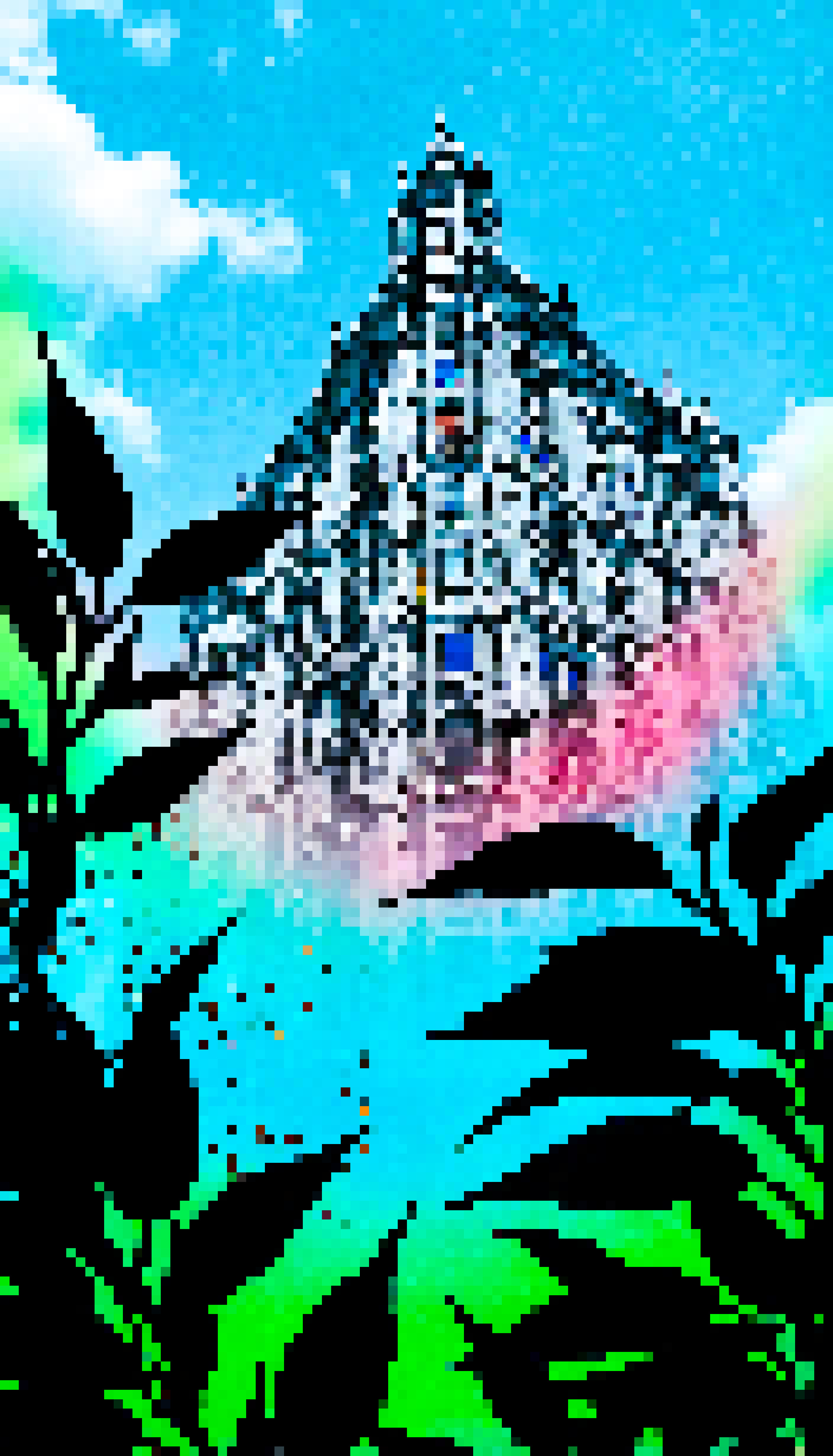 The middle section has the most activity and seems to be a blend of different elements: on the left there's a portion of a green plant likely leaves; on the right there are additional architectural features resembling a European-style street scene with what looks like storefronts; and at the bottom there is an animated depiction of a rainbow arching over the scene.