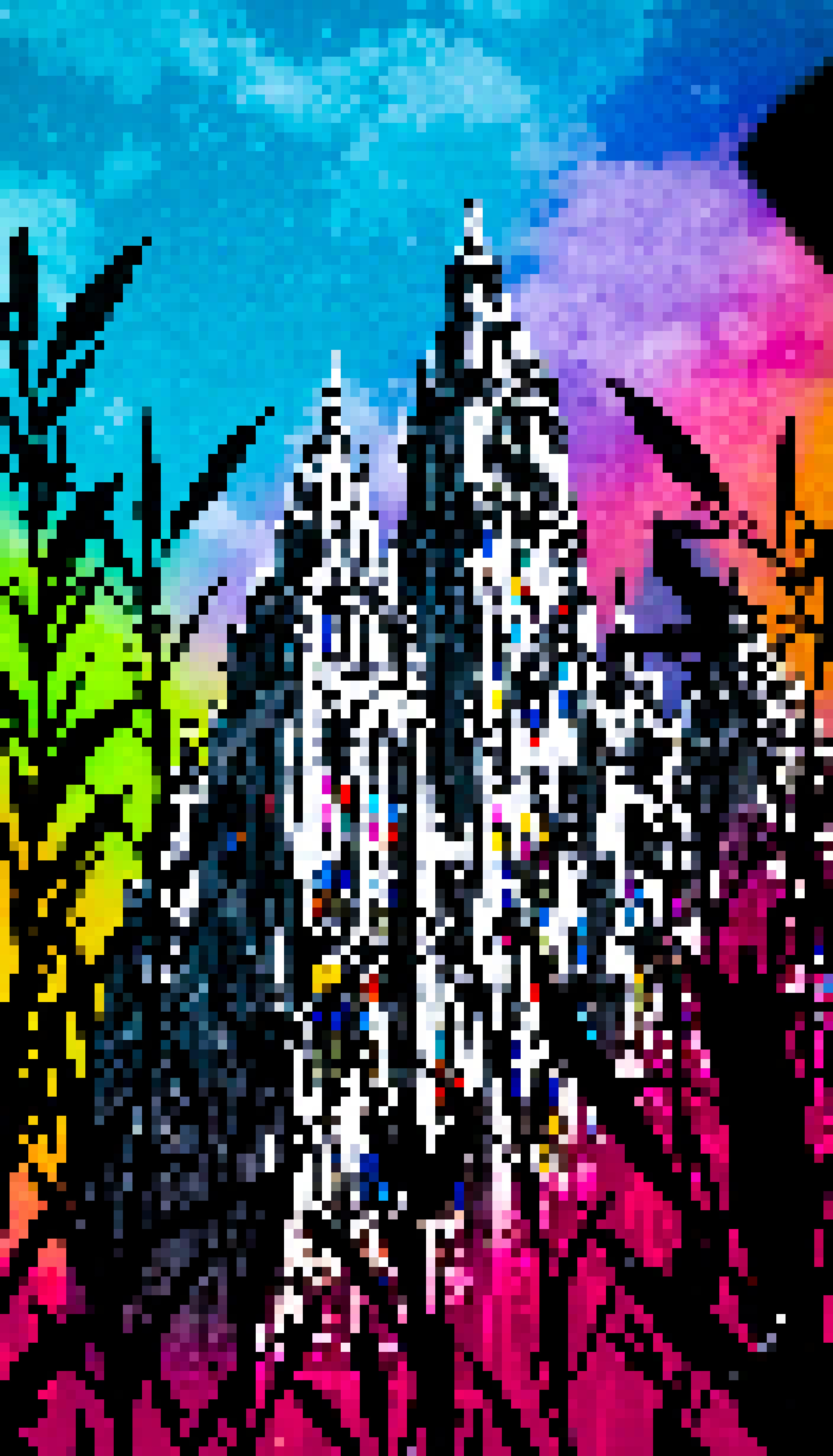 The image is a digital artwork that combines two different scenes. In the top half there is a vibrant and colorful depiction of an old church with multiple steeples featuring what appears to be a rainbow flag on one of them. The church's architecture suggests it may be located in a city or town center. Surrounding the church are various colorful elements such as flags and banners.