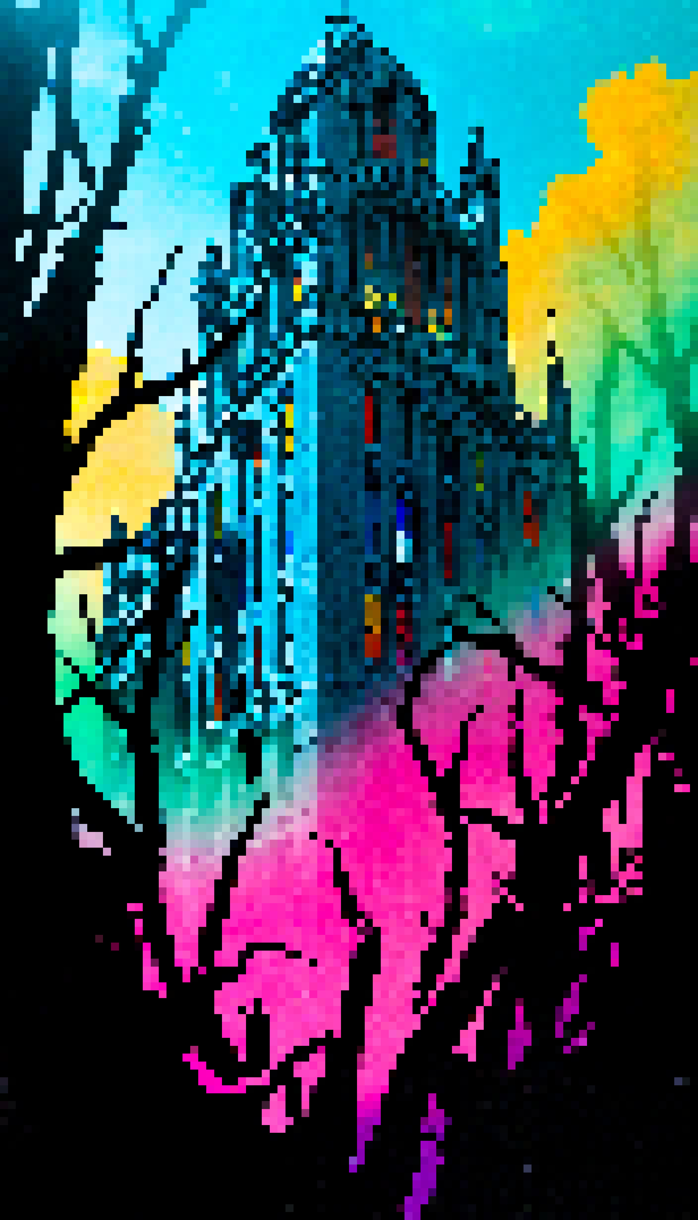 The image is a digital art piece that captures the iconic gothic revival style architecture of the Palace of Westminster more commonly known as Big Ben set against the backdrop of a nighttime sky filled with clouds and a full moon. The palace itself is bathed in shades of purple and pink while the surrounding trees are tinged with hues of blue and green adding to the surreal and dreamlike quality of the image. The palace's clock face which is a prominent feature of the structure is clearly visible. Additionally the palace windows emit a soft glow illuminating the facade in contrast to the surrounding darkness. The overall color palette of the image leans towards pastel tones with occasional brighter spots that add depth and dimension to the scene.